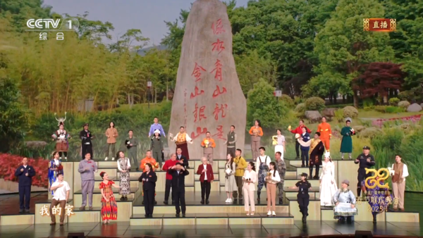 合唱歌曲《我的家》中,四十多位生态文明建设者代表共唱“我的家,到处都是绿的”,展现20年来对“绿水青山就是金山银山”理念的生动实践,铺展开一幅生态美、产业兴、百姓富的美丽中国新画卷。