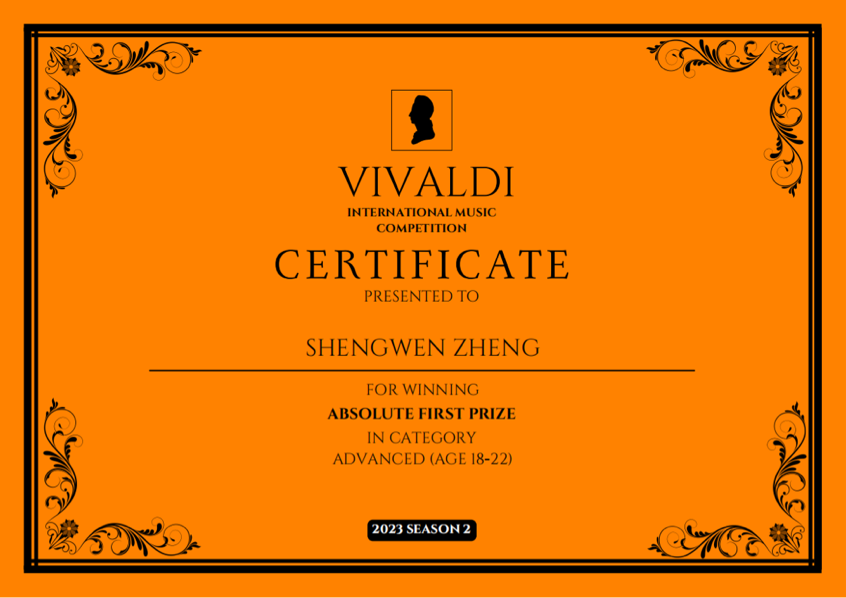 近日,维瓦尔第国际音乐比赛第二赛季(Vivaldi International Music Competition)落下帷幕,学院作曲与指挥系指挥221班郑盛文(指导教师:周杰副教授)荣获ADVANCED(AGE 18-22)高级组一等奖,并获特别奖——Excellent Technique奖项。