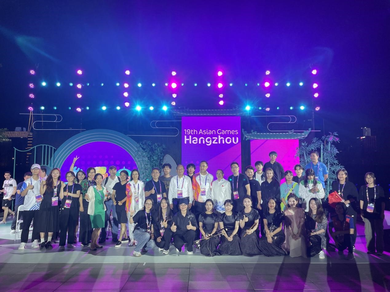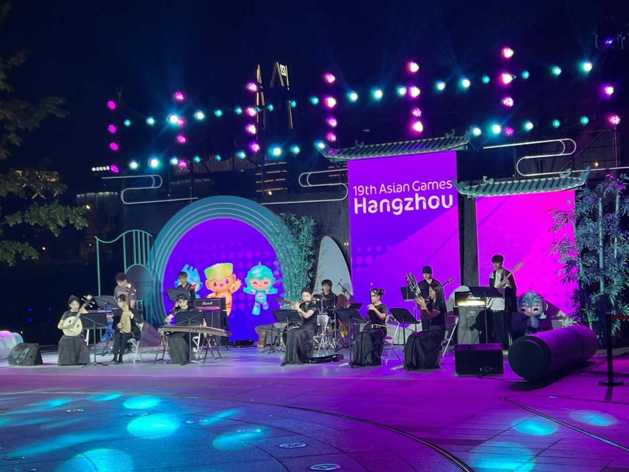 献礼祖国华诞,喜迎亚运盛事。10月1日, 恰逢中华人民共和国74周年华诞,学院国乐系教授杜竹松受杭州亚组委之邀率队赴亚运村演出。此次演出包括学院国乐系、流行音乐系师生,在杭州亚运村为来自世界各国的运动员们展示了中国传统音乐与现代电子音乐的完美融合。