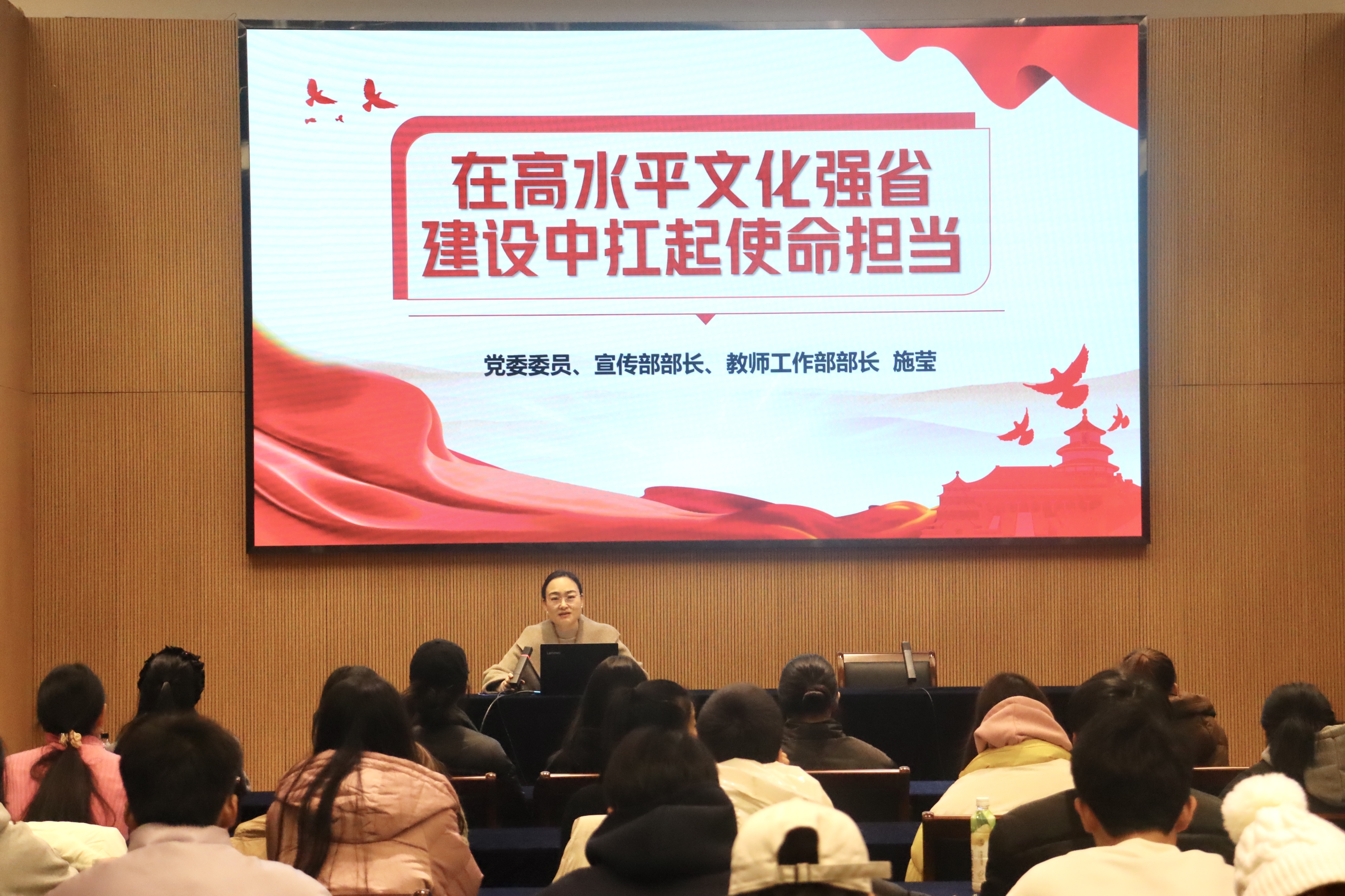 12月4日下午,党委委员、宣传部部长、教师工作部部长施莹以“在高水平文化强省建设中扛起使命担当”为题,为戏剧系学子讲授《形势与政策》课。