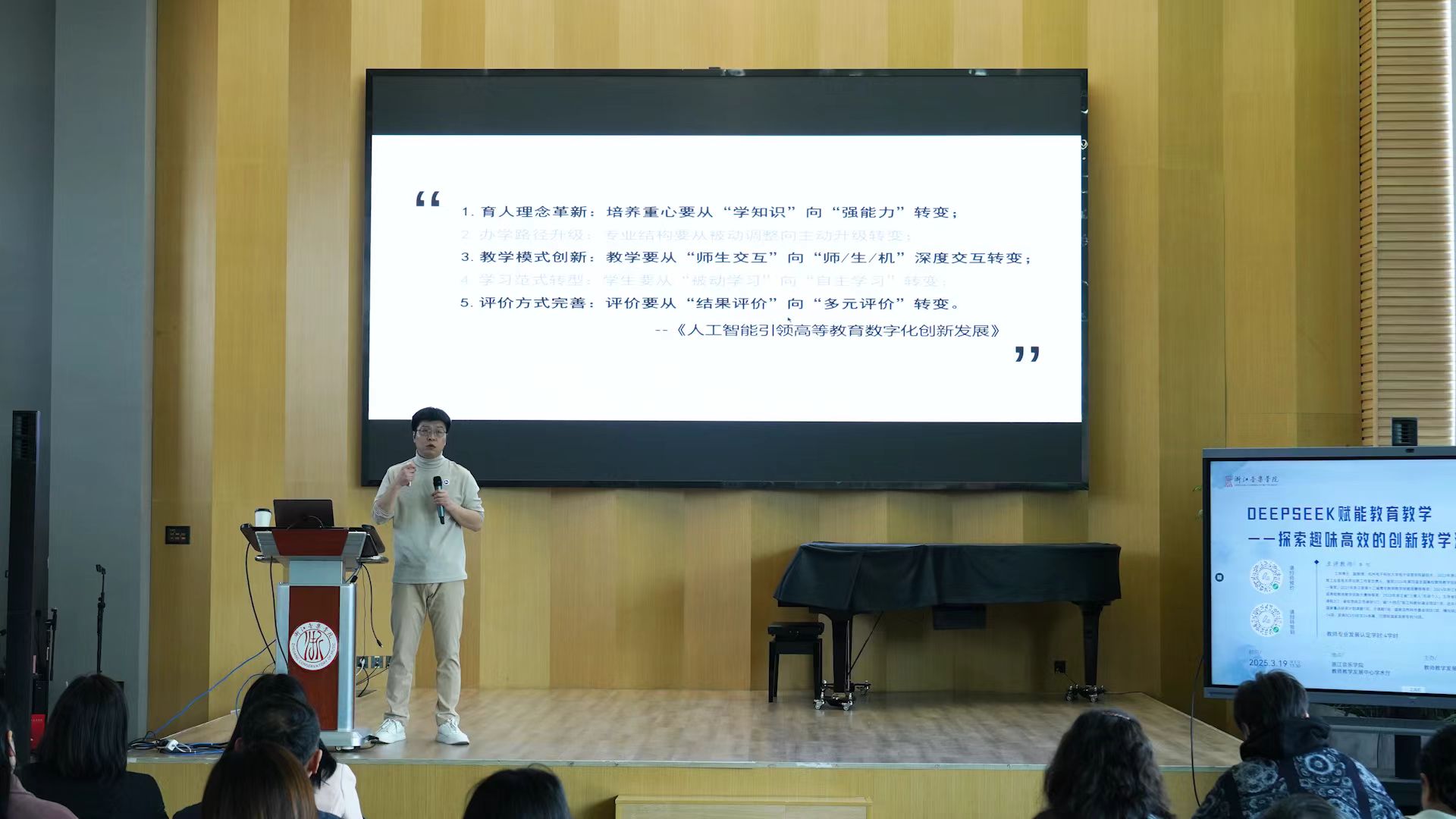 李竹结合自身教学实践,通过具体课程案例生动阐释人工智能技术在教学中的创新应用,重点展示了如何借助DeepSeek等AI工具增强课堂趣味性、提升教学效率,并强调应随之调整教学目标,将培养学生创新能力置于更核心的位置。讲座内容不仅涵盖课堂教学革新,还延伸至教师科研与行政事务领域。他现场演示了AI技术在文献检索、数据分析、论文撰写等科研环节的辅助功能,同时分享了如何利用智能工具自动化处理日常事务性工作,有效减轻教师工作负荷,使其能更专注于教学科研主业。在互动环节,他针对现场教师提出的“DeepSeek能否实现总谱自动生成分谱”等专业问题,通过实时操作演示揭示了AI技术在音乐教学场景中的实践价值。