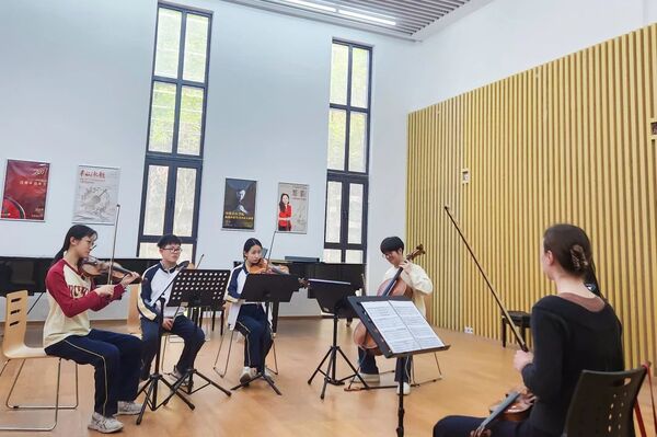 新魄力四重奏则在室内乐教学中,强调“声部角色化”的重要性和语言逻辑与音乐表达的深层关联。他们独特的国际化视野,也为音乐教学赋予了全新方式与多元内涵。例如,他们会通过分析德语诗歌韵律,向学生们解构乐句走向、诠释声部留白。“德语严谨的语法结构塑造了德奥音乐的句法特征,单词重音与乐句呼吸存在天然同构性。我将这种认知转化为音色修辞学讲授给学生——用揉弦深浅比拟元音共鸣,以运弓力度对应语句重音,使器乐演奏呈现出文学性的叙事层次。”申丹枫说道。