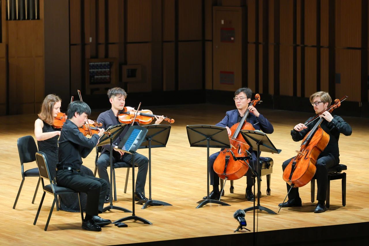 上半场的舒曼《A大调第三弦乐四重奏》被注入东方美学基因,第一小提琴申丹枫以古琴吟猱般的运弓技法驱动发声,使精密的音乐架构彰显出东方线性游走的美学特质。两组弦乐声部在呼吸咬合间构建起动态“建筑”,第二小提琴安东尼娅(Antonia Rankersberger)与中提琴吕翔的和声铺陈如榫卯相接,在弹性速度中推动音乐叙事的演进。“新魄力”以古乐器般的纯净音色重塑“极柔和的”意境,并通过“突强”的爆发性与“渐弱”悬置感塑造戏剧张力,激活了舒曼音乐中蛰伏的狂想基因,在机械美感与情感激荡间走出自己的现代性诠释。