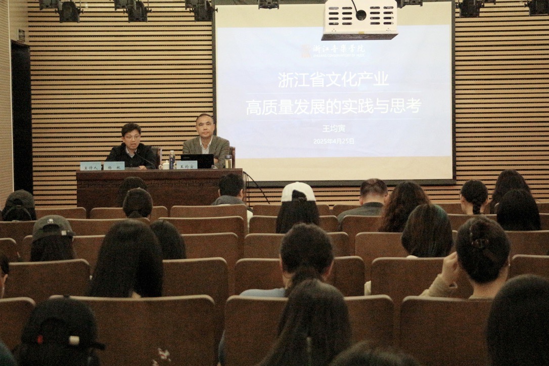 讲座伊始,王均寅深入浅出地介绍了文化产业的定义、内涵特征及其重要地位。他指出,文化产业不仅能够提升国家的综合竞争力,更是国民经济的重要增长点,也为社会提供了丰富的精神食粮,有助于满足人民日益增长的精神文化需求。他结合详实数据,深入分析了浙江文化产业的发展现状,以及在文化产业领域的创新实践。与此同时,王均寅也深刻分析了浙江文化产业面临的挑战和机遇,特别是良好的政策环境、深厚的文化底蕴和强大的市场需求,都为音乐院校学生带来前所未有的机遇。他希望同学们认真思考自己在全省文化旅游产业的发展大潮中的位置,并建议大家关注文化产业的发展趋势,提升自身的科技素养和创新能力,积极探索音乐与科技、旅游、教育等领域的跨界融合,为文化产业的发展贡献自己的力量。他还与同学们展开互动讨论交流,现场气氛热烈。