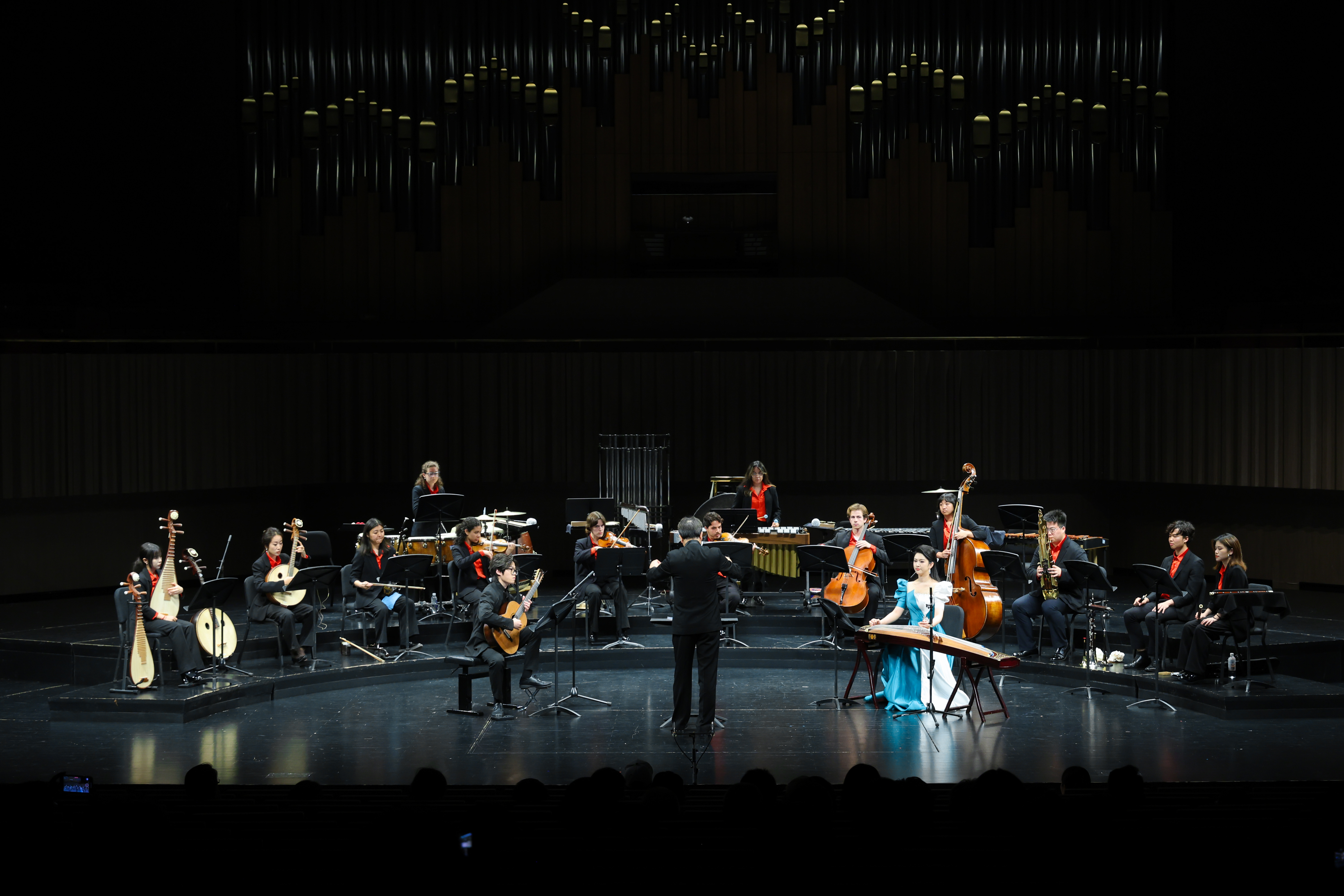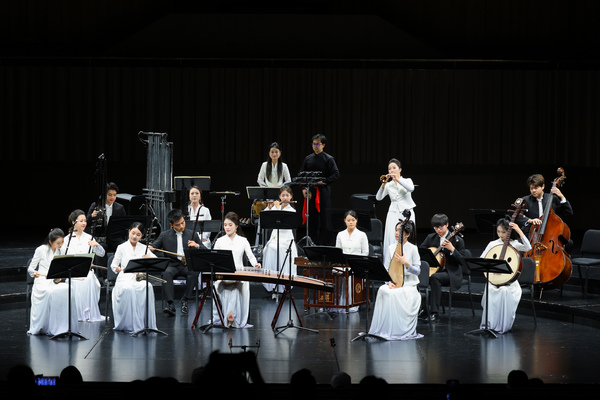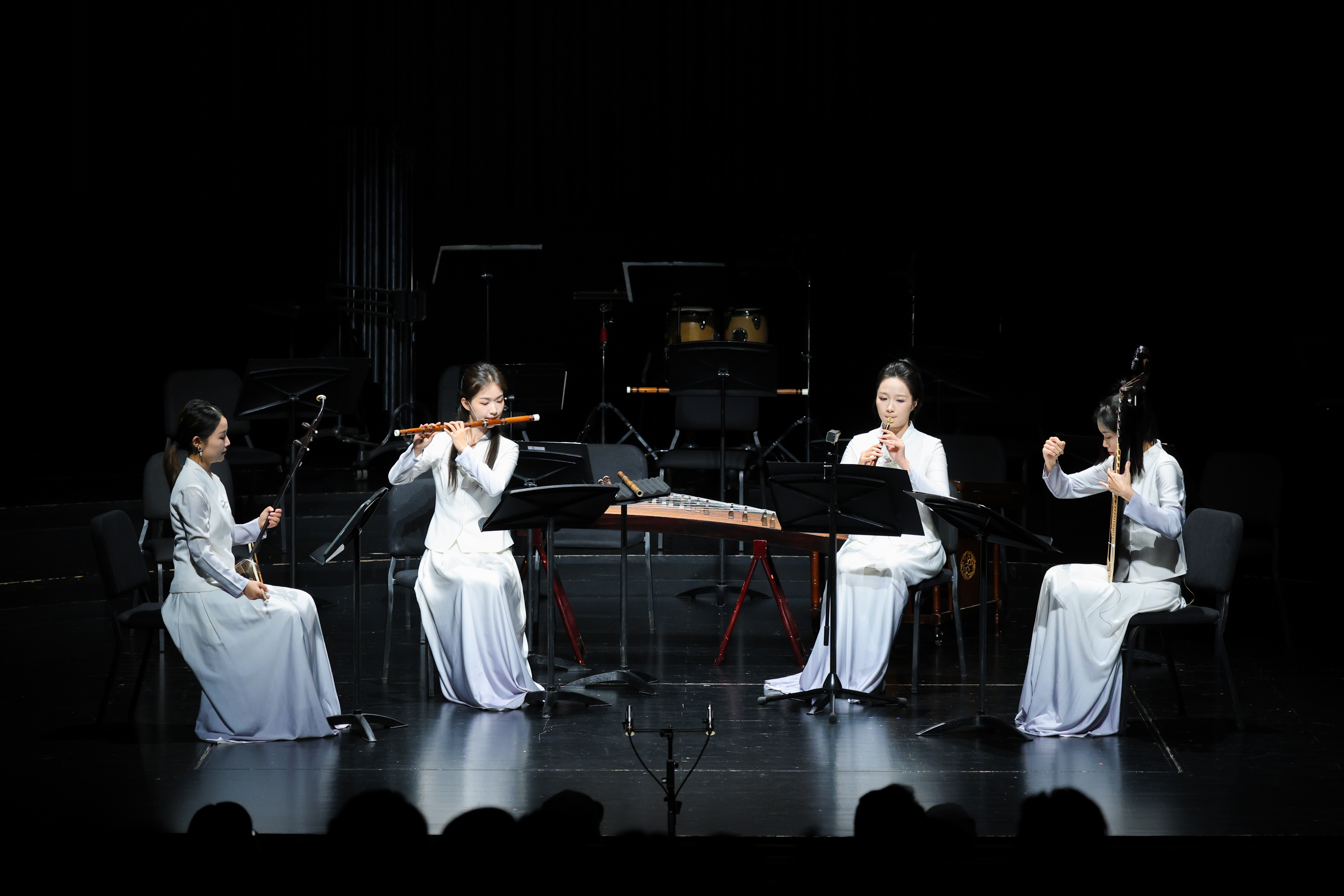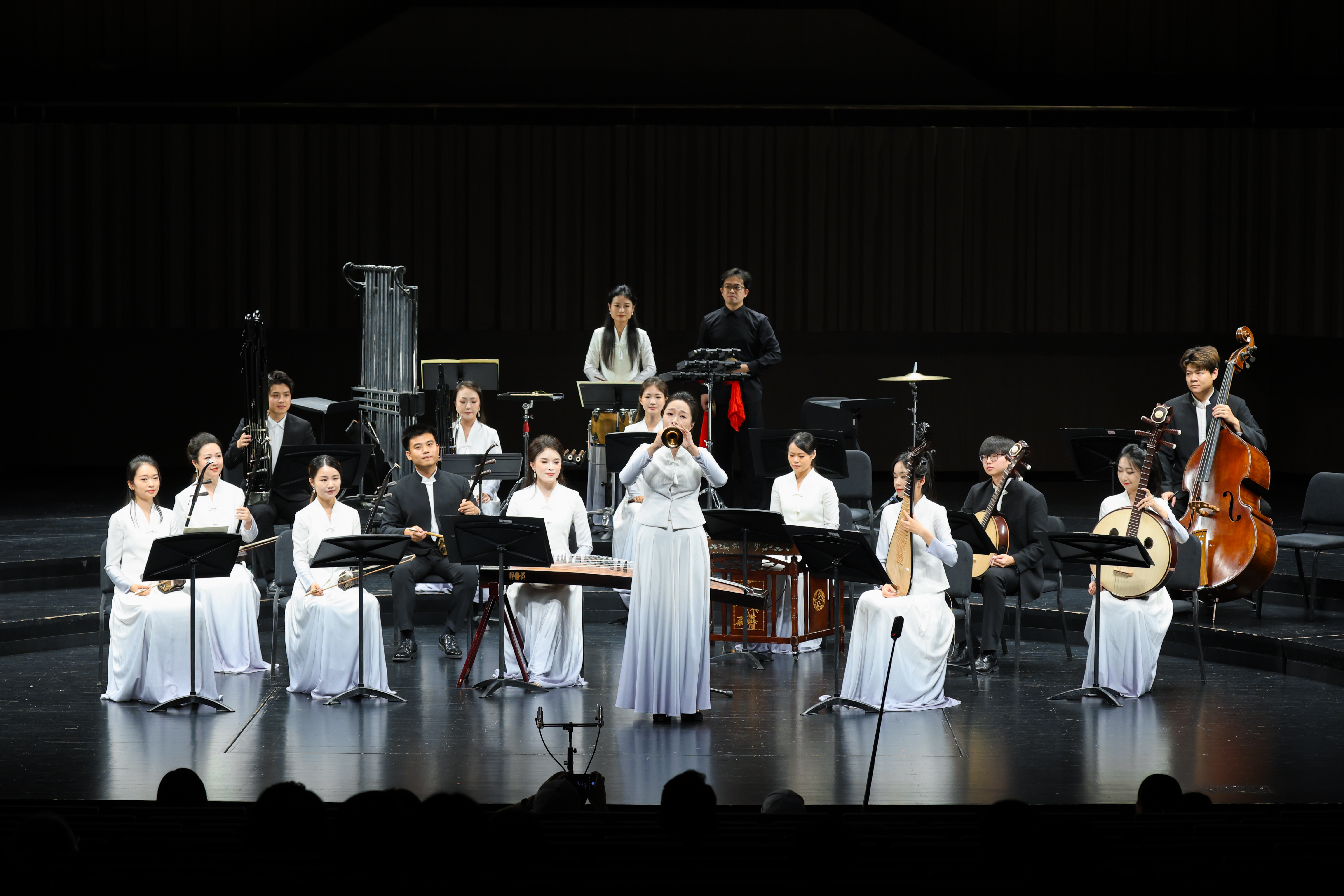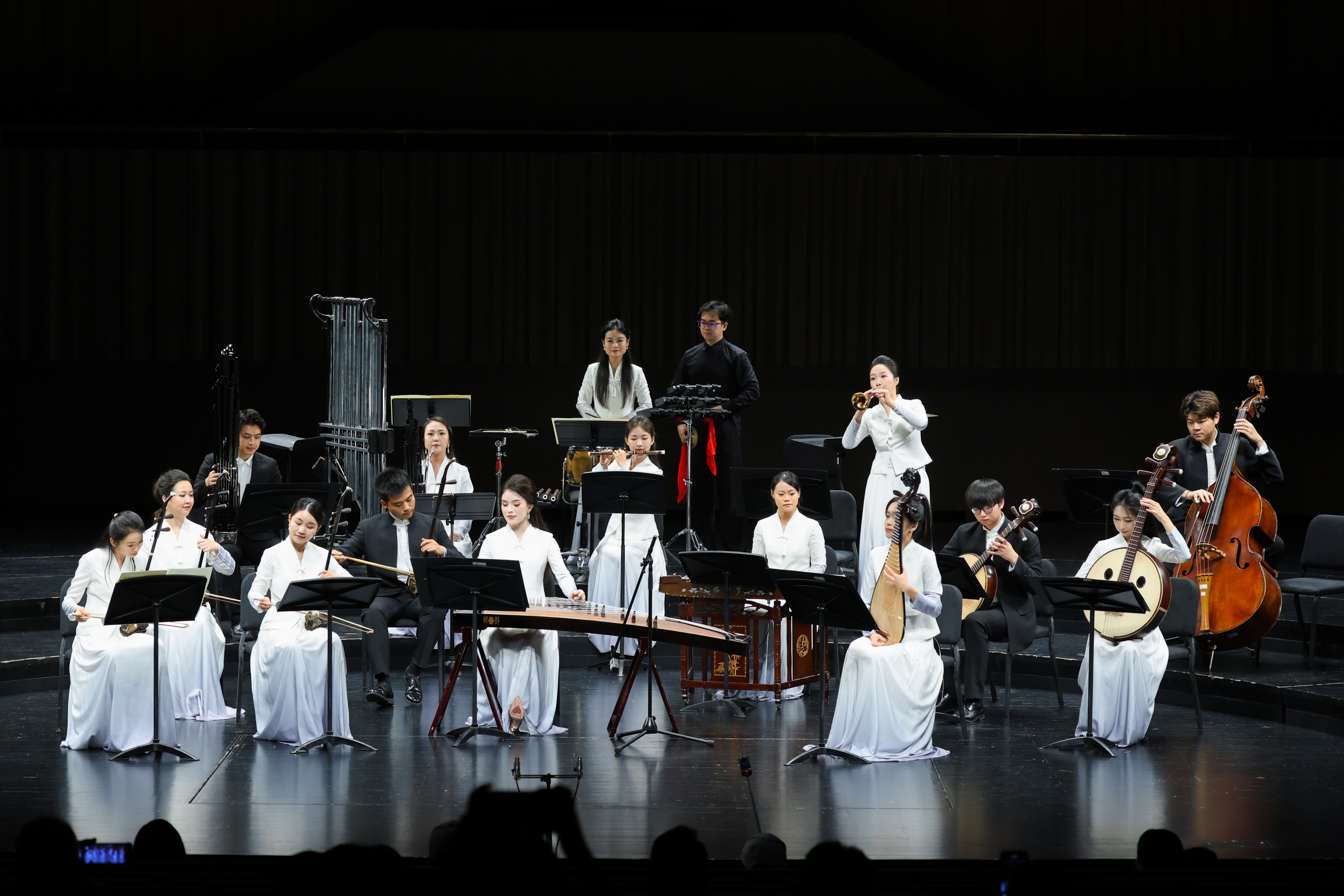 随后,浙音民族室内乐团带来的4部作品,奏响了中国音乐在当代的传承与创新之声。四重奏作品《染》由乐团青年演奏家黄琳、裴文钰、陈铭楠、张晶洁共同演绎,通过强烈的情绪色彩表达,以创新性的现代语汇展现了民族室内乐的大胆探索;《诗语江南》由乐团青年古筝演奏家楼琳与乐团共同演奏,以浙江音乐为主题,借流淌的筝韵诠释了浙韵之美,勾勒出烟雨江南的温婉诗意与灵动气韵;作品《寒山》沿袭了勋伯格无调性及音色结构的创作理念和手法,借悠远空灵的“钟鸣”,营造出“寒山闻钟”的清冷意象与极具东方韵味的音乐意境;唢呐与乐队作品《太阳出来喜洋洋》则用热烈欢腾的唢呐传递出民间最质朴的喜悦之情,将现场气氛推向高潮。