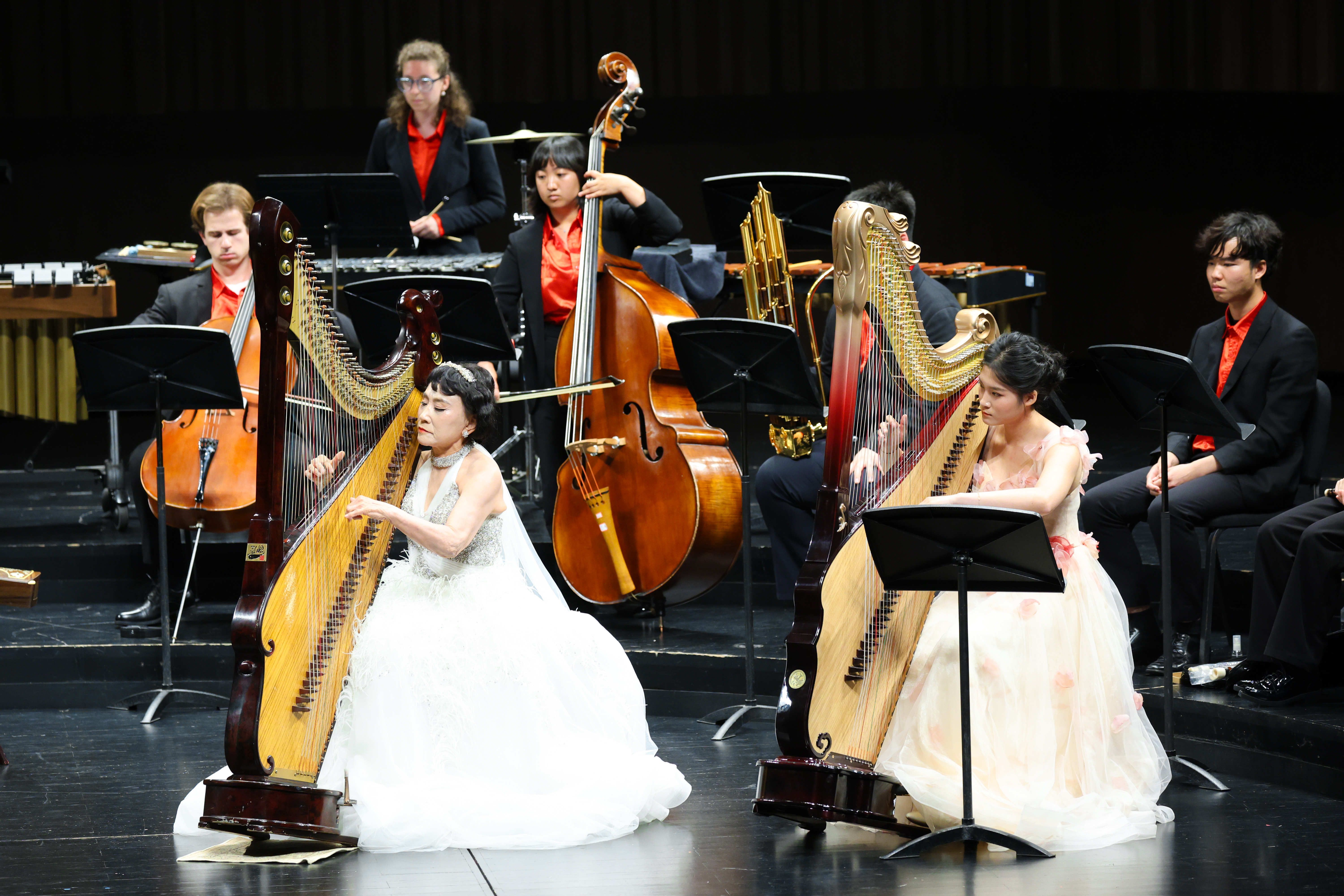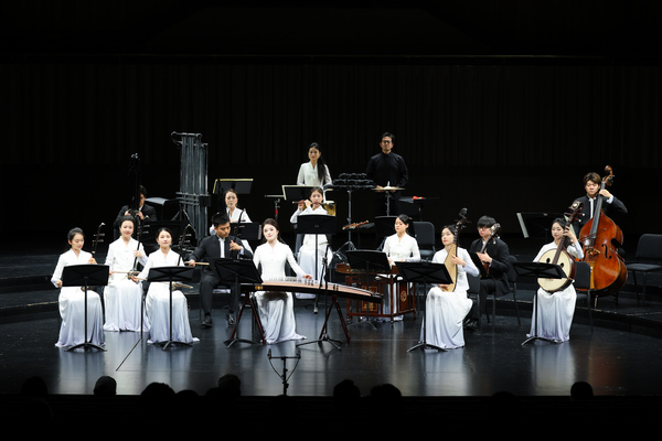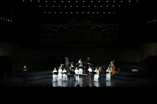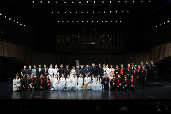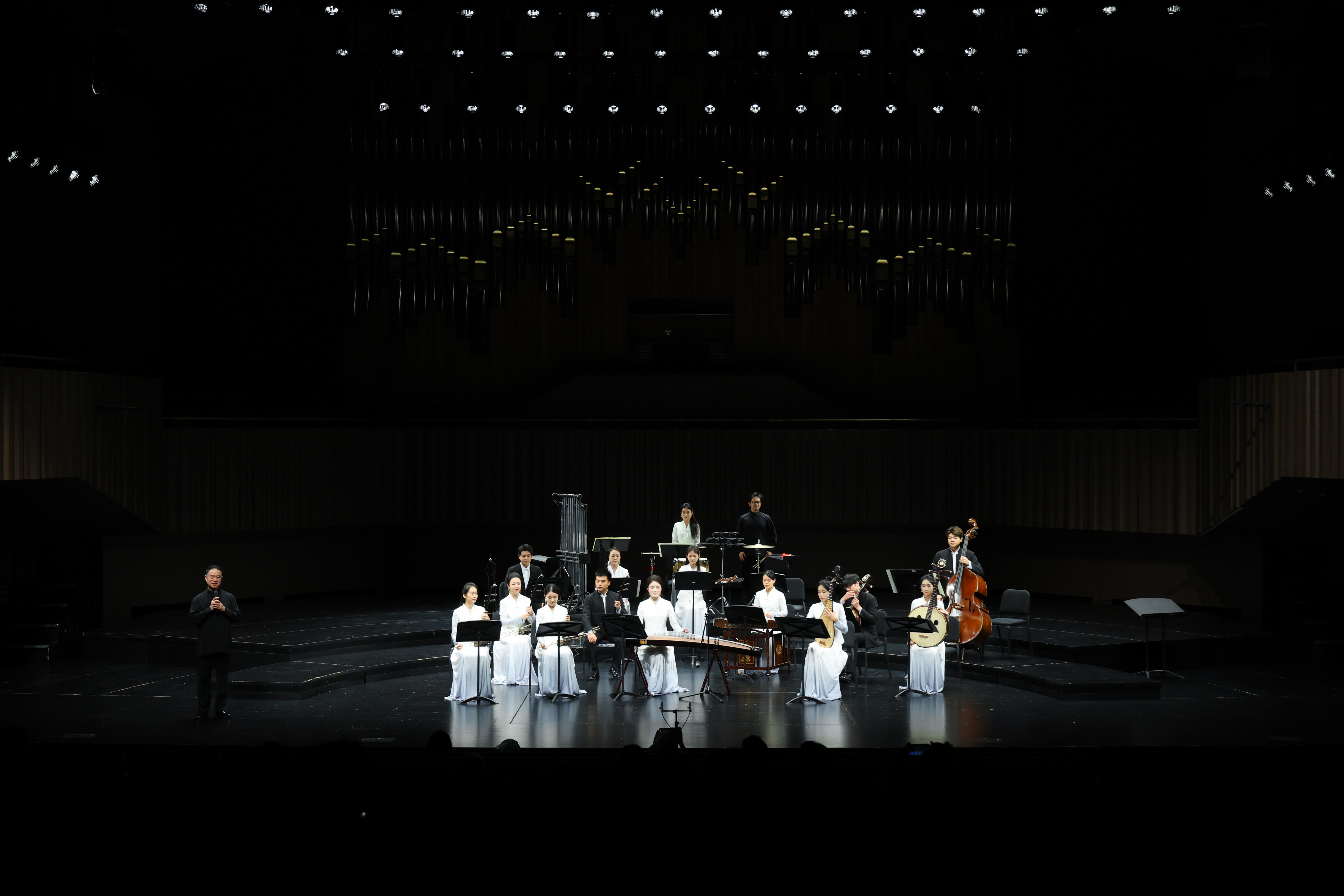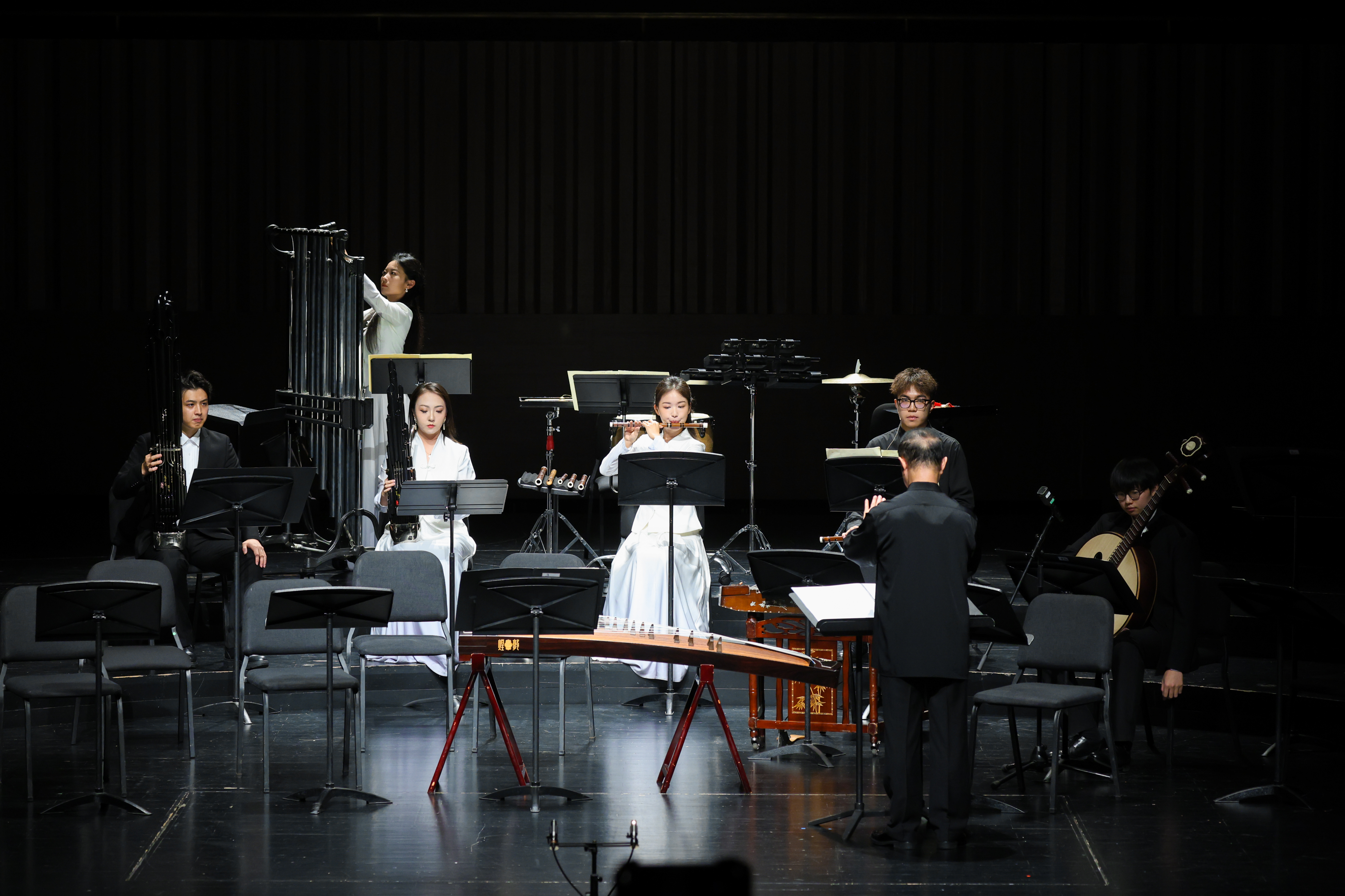 随后,浙音民族室内乐团带来的4部作品,奏响了中国音乐在当代的传承与创新之声。四重奏作品《染》由乐团青年演奏家黄琳、裴文钰、陈铭楠、张晶洁共同演绎,通过强烈的情绪色彩表达,以创新性的现代语汇展现了民族室内乐的大胆探索;《诗语江南》由乐团青年古筝演奏家楼琳与乐团共同演奏,以浙江音乐为主题,借流淌的筝韵诠释了浙韵之美,勾勒出烟雨江南的温婉诗意与灵动气韵;作品《寒山》沿袭了勋伯格无调性及音色结构的创作理念和手法,借悠远空灵的“钟鸣”,营造出“寒山闻钟”的清冷意象与极具东方韵味的音乐意境;唢呐与乐队作品《太阳出来喜洋洋》则用热烈欢腾的唢呐传递出民间最质朴的喜悦之情,将现场气氛推向高潮。
