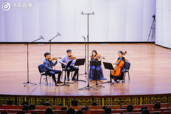 随着全场观众热烈的掌声,音乐会正式开始。本场音乐会上半场演奏的第一首作品选自瓦格纳《公主梅特涅的专辑》中的《浪漫曲》,由著名青年小提琴演奏家、中央音乐学院副教授岳麟携手钢琴演奏家史佳怡共同演绎。主题乐思在连绵的弦乐与钢琴的交错之间不断展开、此起彼伏,让观众感受到瓦格纳的浪漫思绪以及对情感、时间的缅怀。第二曲由“杭州四重奏”演绎贝多芬《C大调第九弦乐四重奏》(OP.59,No.3)。“杭州四重奏”由学院管弦系4位青年优秀教师、演奏家组成,致力于打造一支国际化、高水平的弦乐四重奏专业演奏团体。这部作品创作于1806年,也被称为“英雄四重奏”“拉兹莫夫斯基四重奏”。此次“杭州四重奏”对音乐的诠释张弛有度,演奏家之间的默契成为打开作品演绎的关键,各声部的配合与诉说,充满了个性与张扬、炙热与渲泄,将晚期贝多芬的执着冷静、哲理思考娓娓道来。