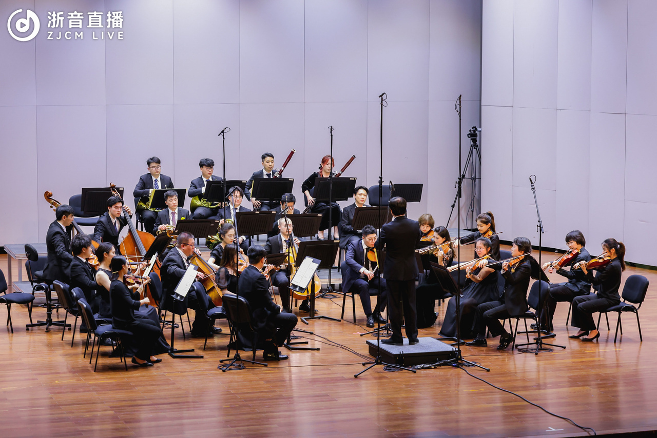 音乐会下半场由学院室内管弦乐团带来罗西尼歌剧《布鲁斯基诺先生》序曲以及莫扎特《g小调第二十五交响曲》(KV.183)。室内管弦乐团是一支隶属于学院的高水平职业乐团,也是中国第一支以室内乐为建制的职业管弦乐团。乐团特邀旅德指挥家焦阳担任艺术总监,乐团成员也由来自于国内外的优秀音乐家、独奏家组成,他们以精湛的演奏技巧共同追求着精致而富有活力的管弦齐鸣。乐团首先演绎了《布鲁基诺先生》序曲,瞬间点燃了下半场的情绪。作品的演奏摒弃了传统意大利式的粉饰风格,以趣味盎然的思维,诠释着人们在现实中时而窘迫失控、时而欢乐热闹的生活面貌。接下来是本场音乐会的最后一曲、莫扎特的经典之作《g小调第二十五交响曲》。g小调的旋律洋溢着一种忧伤的气息,尽管偶尔的抒情段落令人感到片刻的轻松,但稍纵即逝,无疑是对莫扎特的永恒解读与纪念,同时也是对经典的回望与致敬。曲毕,闭幕式音乐会在欢呼与雀跃声中圆满落幕。