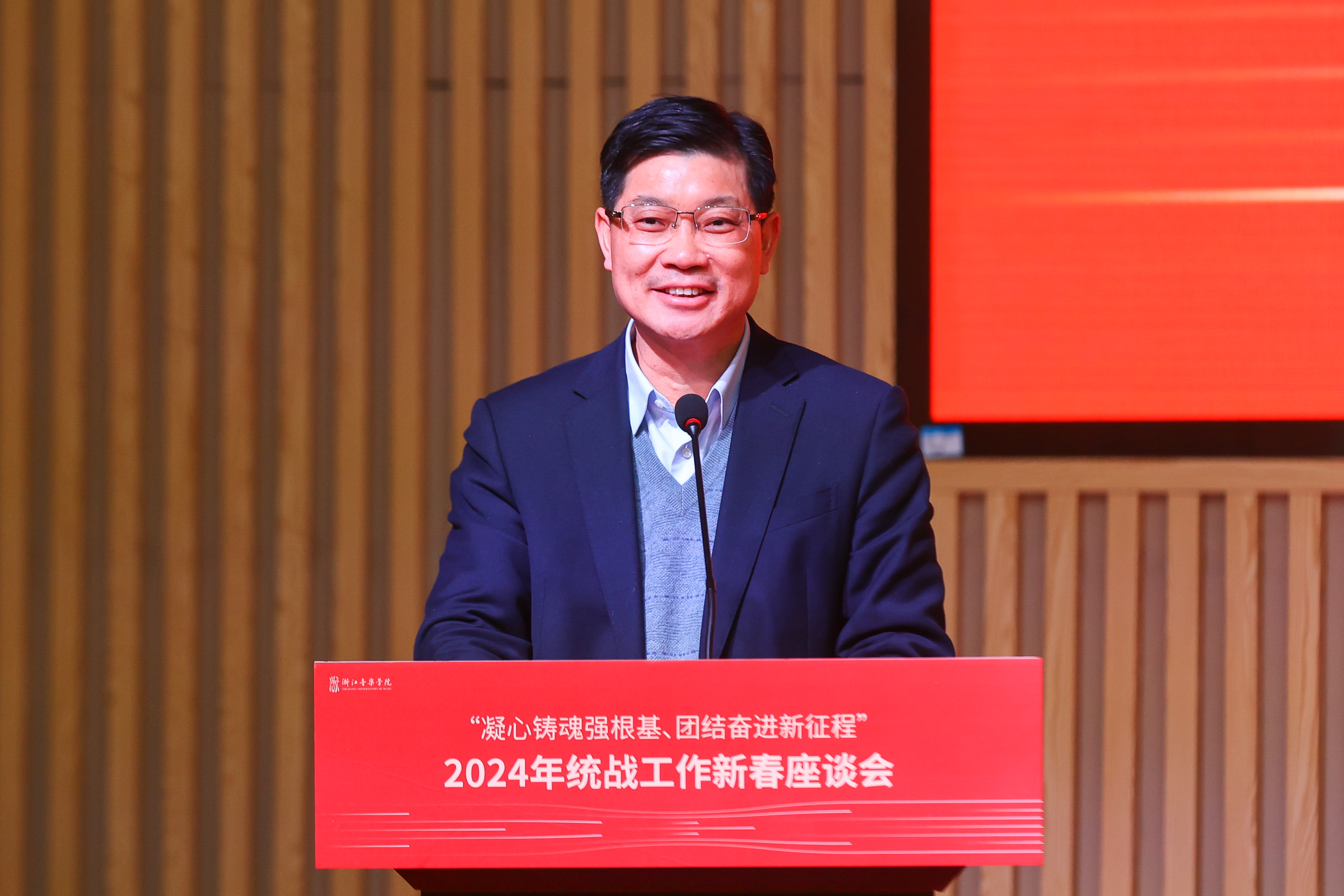 会上,他指出,2024年是全面贯彻党的二十大精神的深化之年,是新中国成立75周年,学校党委将继续团结带领大家凝心聚力谋发展、奋发有为开新局。他勉励大家:一是持续推进政治引领。要深入学习贯彻习近平新时代中国特色社会主义思想,持续开展党的二十大、省第十五次党代会和历次全会精神的学习宣传贯彻,进一步筑牢同党组织亲密合作的思想基础,努力把智慧和力量凝聚到贯彻学校党委工作部署上来,不断提升理论修养、政策水平和专业能力。二是发挥好智力优势。要借助自身优势和各类统战工作载体,着重围绕国家重大战略和浙江经济社会发展需要,以平台建设为支撑,以重大理论创新为重点,努力创作出受大众欢迎的文艺精品力作,继续助力学校高水平办好各类音乐艺术品牌活动。三是提高参政议政水平。要结合自己的研究方向、工作领域,围绕学校中心工作开展深入调研,不断提升统战理论研究能力,为学校党政工作积极建言献策,为文化强省建设提出高质量的议案、提案和建议。四是利用好统战平台。要发挥好各类统战人才平台作用,在“引育用留”四个环节中发挥重要力量,积极参与两大矩阵建设,共同助力打造“同心归音”统战品牌,努力在深化国际交流与合作中找到统战工作着力点和突破点。